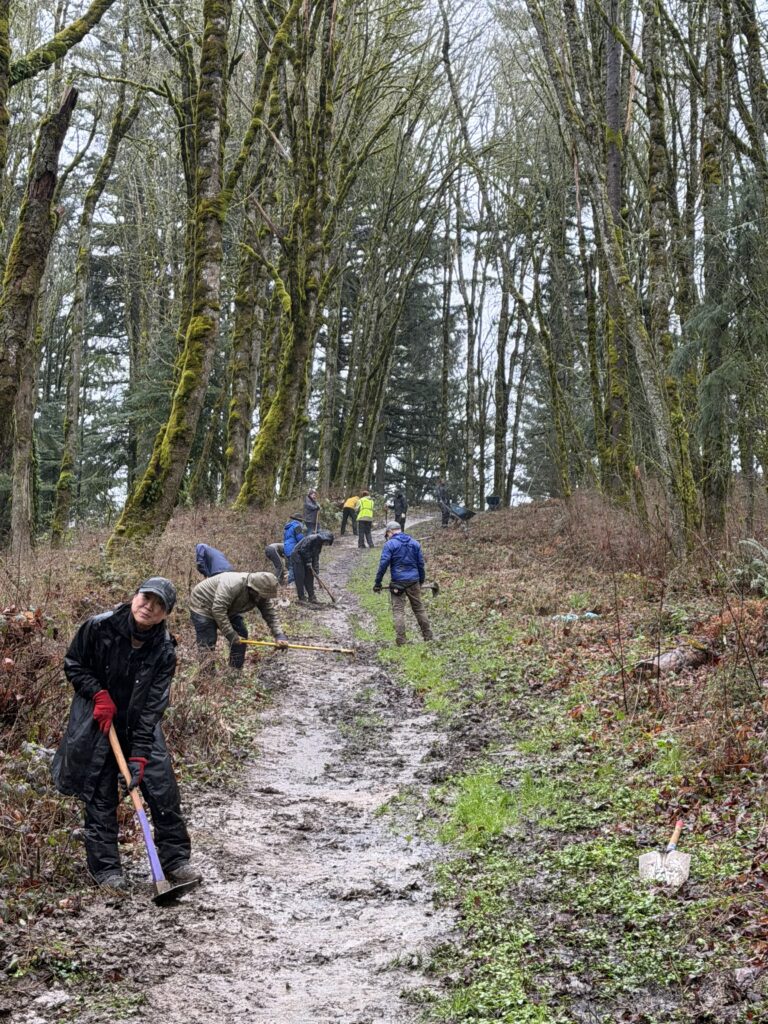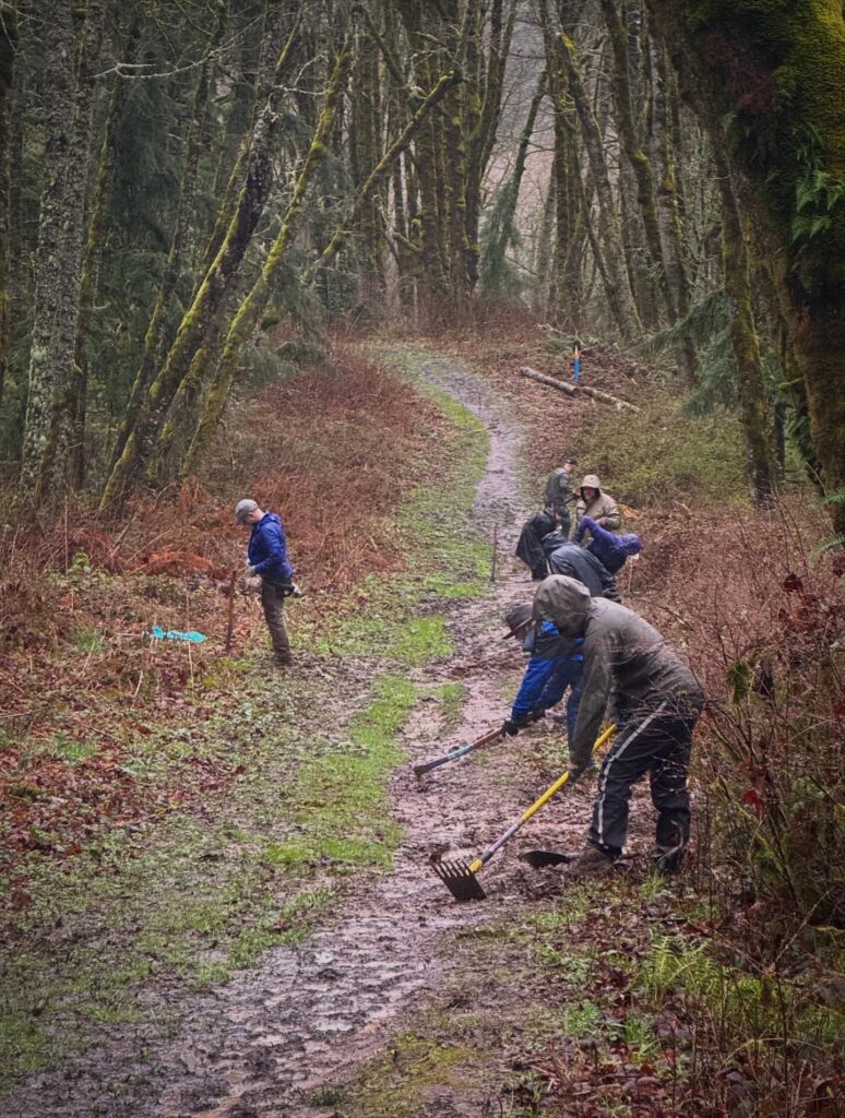The fix? Clear the muck. Dig shallow drainage ridges along the edges of the trail to redirect water runoff. And do it in the rain, because this is Portland, Oregon, and waiting for a dry day isn’t really an option.